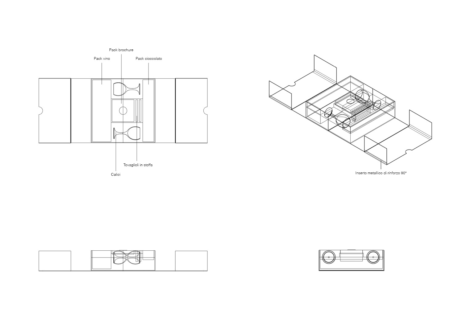 We therefore speak of an adult and refined target. Shown here on the side is the wireframe of the box I designed for this project, and all the components inside.